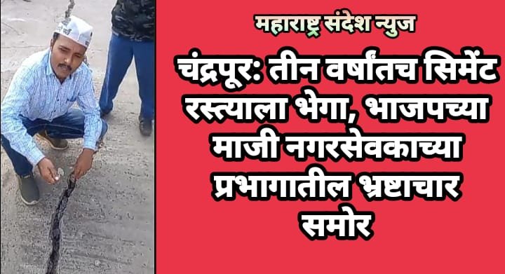 महाराष्ट्र संदेश न्युज ! ऑनलाईन चंद्रपूर, दि. १० डिसेंबर:- चंद्रपूर शहरातील नगीना बाग प्रभागातील स्वालंबी नगर मधील गुलमोहर कॉलनी परिसरात तीन वर्षांपूर्वी सिमेंट रस्ता बांधण्यात आला होता. मात्र, तीन वर्षांतच या रस्त्याला मोठे मोठे भेगा पडले आहेत. स्थानिक नागरिकांनी याबाबत आम आदमी पक्षाला तक्रार केली. त्यानंतर आम आदमी पक्षाने रस्त्याचा प्रत्यक्ष पाहणी करून त्याचा खुलासा केला आहे.
