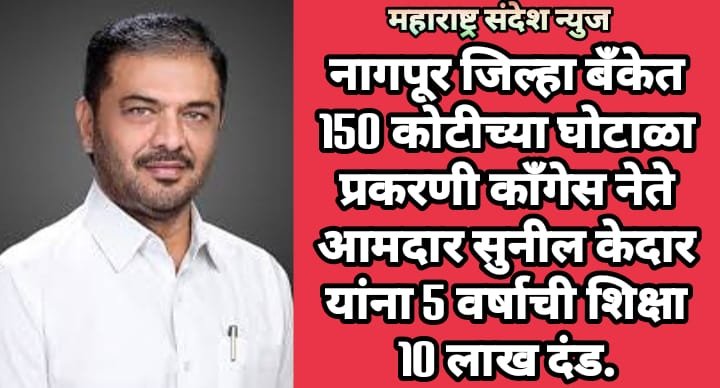 महाराष्ट्र संदेश न्युज ! ऑनलाईन नागपूर:- येथून एक महत्वपूर्ण माहिती समोर येत आहे. महाराष्ट्र राज्याचे माजी पशु संवर्धन व दुग्ध विकास मंत्री व काँग्रेसचे आमदार सुनील केदार यांना नागपुर जिल्हा अतिरिक्त मुख्य न्याय दंडाधिकारी यांनी 5 वर्षाची जेल आणि 10 लाखाचा दंडाची शिक्षा ठोकावली आहे. त्यांना नागपूर जिल्हा मध्यवर्ती सहकारी बँकेतील कोट्यवधी रुपयांच्या सरकारी रोखे खरेदी घोटाळ्यात ही शिक्षा झाली आहे.