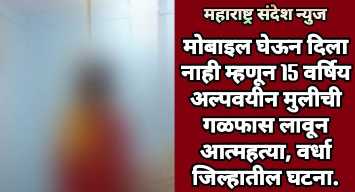 महाराष्ट्र संदेश न्युज ! ऑनलाईन वर्धा:- जिल्हातून एक धक्कादायक घटना समोर आली आहे. येथील सिंदी रेल्वे येथे मोबाइल घेऊन दिला नाही म्हणून एका 15 वर्षिय अल्पवयीन मुलीने स्नानगृहात गळफास लावून आत्महत्या केली. ही घटना शहरातील चिचघाटपूरा येथे घडली. श्रावणी रायभान मसराम असे आत्महत्या केलेल्या मुलीचे नाव आहे. ही घटना समोर येताच संपूर्ण शहरात खळबळ उडाली आहे.