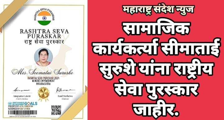 महाराष्ट्र संदेश न्युज ! ऑनलाईन वाशीम:- सामाजिक कार्यकर्त्या आणि राष्ट्रवादी काँग्रेस पक्षाच्या नेत्या, सीमा फाउंडेशनच्या अध्यक्षा सीमाताई सुरूशे यांना या वर्षीचा व्हेली फाऊंडेशनचा वतीने देणाऱ्या येणारा मनाचा समजल्या जाणारा राष्ट्रीय सेवा पुरस्कार जाहीर झाला आहे. सामाजिक, सांस्कृतिक, व राजकीय क्षेत्रामध्ये उल्लेखनीय कार्य करणाऱ्या व्यक्तीला हा मनाचा पुरस्कार दरवषी देण्यात येत असतो. यावर्षी हा पुरस्कार सीमा सुरुशे यांना देण्यात येणार आहे.