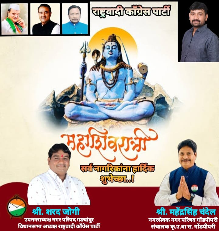 महाराष्ट्र संदेश न्युज ! ऑनलाईन:- श्री. शरद जोगी उपनगराध्यक्ष नगर परिषद गडचांदुर तथा विधानसभा अध्यक्ष राष्ट्रवादी काँग्रेस पार्टी,श्री. महेंद्रसिंह चंदेल, नगरसेवक नगर परिषद गोंडपीपरीतथा संचालक कृषी उत्पन्न बाजार समिती गोंडपीपरी, श्री. नितिन भटारकर जिल्हाध्यक्ष चंद्रपूर राष्ट्रवादी काँग्रेस पार्टी यांच्या कडून सर्व नागरिकांना महाशिवरात्रीच्या हार्दिक शुभेच्छा.