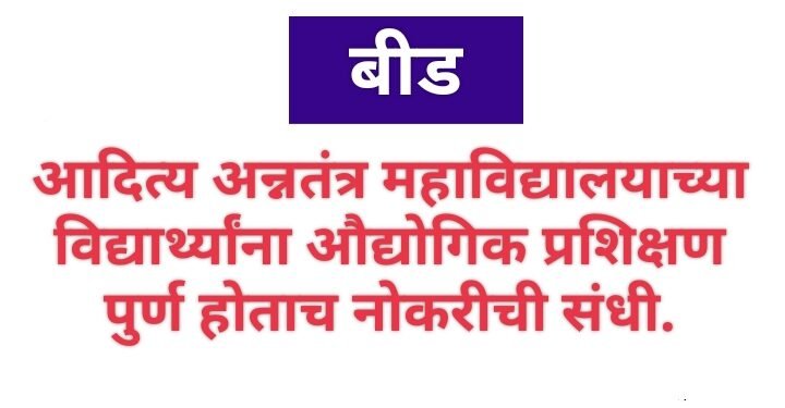 आदित्य अन्नतंत्र महाविद्यालय बीड येथील अंतिम वर्षातील विद्यार्थ्याच्या अभ्यासक्रमाचा भाग म्हणून आठव्या सत्रातील विद्यार्थी व विद्यार्थीनींना औद्योगीक प्रशिक्षणासाठी चार महिन्याच्या कालावधीकरिता बहुराष्ट्रीय आणि राष्ट्रीय अन्नप्रक्रिया कंपनीमध्ये प्रशिक्षणास पुणे, मुंबई, गुजरात, नाशिक, बांगलोर, दमण, बारामती, औरंगाबाद, इंदोर, नागपुर, इ. जिल्ह्यात तसेच परराज्यात महाविद्यालयाच्या ट्रेनिंग आणि प्लेसमेंट सेलच्या माध्यमातून पाठविण्यात येनार आहे.