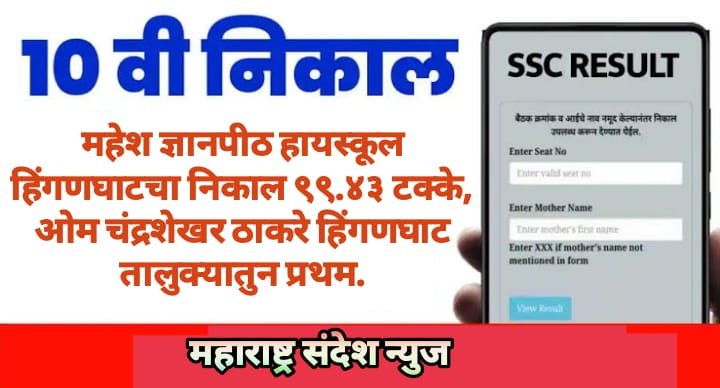 महाराष्ट्र संदेश न्युज ! ऑनलाईन हिंगणघाट:- महेश ज्ञानपीठ हायस्कूल, हिंगनघाट येथील एसएससी चा निकाल ९९.४३% निकाल लागला असून ओम चंद्रशेखर ठाकरे याने ९८% गुण मिळवून हिंगणघाट तालुक्यातुन प्रथम येण्याचा बहुमान प्राप्त केला.