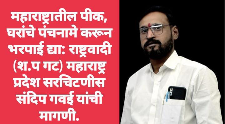 महाराष्ट्र संदेश न्युज ! ऑनलाईन मेहकर:- गत दोन ते चार दिवसापासून मोठ्या प्रमाणात अतीवृष्टी झाली आहे. या अतिवृष्टीमुळे महाराष्ट्रातील जिल्ह्यातील हजारो हेक्टर क्षेत्रातील खरीप पिकांसह घरांचे मोठ्या प्रमाणात नुकसान झाले आहे. या नुकसानीचे पंचनामे करून तत्काळ नुकसान भरपाई द्या, अशी मागणी राष्ट्रवादी काँग्रेस (शरद पवार गट) महाराष्ट्र प्रदेश सरचिटणीस व तथागत ग्रुप महाराष्ट्र राज्य संघटनेचे संस्थापक अध्यक्ष संदिप गवई यांनी केली आहे.