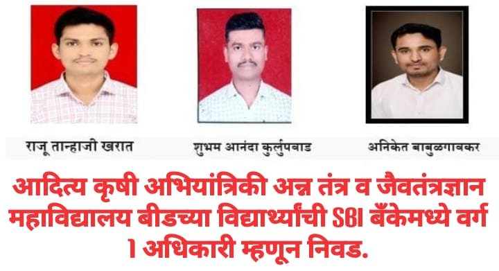 आदित्य शिक्षण संस्थेतील कृषी अभियांत्रिकीचा शुभम कुरलुपवाड, जैवतंत्रज्ञान महाविद्यालयाचा राजू खरात आणि अन्न तंत्रज्ञान महाविद्यालयाचा अनिकेत बाभुळगाकर या तीन विद्यार्थ्यांची भारतीय स्टेट बँकेमध्ये वर्ग 1 अधिकारी म्हणून निवड झाली आहे. आदित्य शिक्षण संस्थेत येणाऱ्या विद्यार्थ्यांना केवळ परीक्षा आणि पुस्तकी ज्ञान न देता विविध उपक्रम राबवून त्यांच्यातील कला गुणांना वाव दिला जातो. त्यामुळेच येथील विद्यार्थी आयुष्याची शिदोरी आणि चांगले संस्कार घेऊन बाहेर पडतात. आज भारतासह परदेशात मोठ-मोठ्या पदावर आदित्य शिक्षण संस्थेचे विद्यार्थी कार्यरत आहेत. विद्यार्थ्यांच्या यशाबद्दल आदित्य शिक्षण संस्थेचे मुख्य प्रवर्तक सुभाषचंद्र सारडा, संचालक डॉ. आदित्य सारडा यांच्यासह वसंतराव नाईक कृषी विद्यापीठ परभणीच्या कार्यकारी सदस्य तथा आदित्य शिक्षण संस्थेच्या संचालिका डॉ. आदिती सारडा, आदित्य कृषी अभियांत्रिकी महाविद्यालयाचे प्राचार्य अमोल सानप व जैवतंत्रज्ञान महाविद्यालयाचे प्राचार्य डॉ. सतीश कचरे अमोल, अन्न तंत्रज्ञान महाविद्यालयाचे प्राचार्य श्याम भुतडा, उपप्राचार्य डॉ. विकास गरजे, उपप्राचार्य अमर सोळंके यांनी अभिनंदन करत पुढील वाटचाली शुभेच्छा दिल्या.