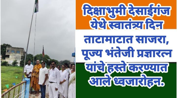 महाराष्ट्र संदेश न्युज ! ऑनलाईन देसाईगंज:- दिक्षाभुमी देसाईगंज येथे स्वातंत्र्य दिन मोठ्या उत्साहात साजरा करण्यात आला. यावेळी सम्यक जाग्रूत बौध्द महीला समीती दिक्षा भूमी देसाईगंज येथे आज दि.15 ऑगस्ट स्वातंत्र्य दिना निमित्त सकाळी पूज्य भन्तेजी प्रज्ञारत्न यांच्या उपस्थितीत बूध्द वंदना घेऊन व ज्ञानाचे महासागर प्रज्ञासूर्य परमपूज्यनीय डाॅ.बाबासाहेब आंबेडकर यांच्या प्रती अपार श्रद्धा व्यक्त करून 7-45 वाजता राष्ट्रीय ध्वजाचे ध्वजारोहण करण्यात आले.व राष्ट्रगीत गाऊन भारतीय संविधान ऊद्देशीकाचे वाचन करण्यात आले.