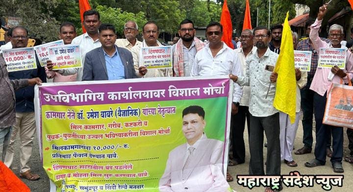 महाराष्ट्र संदेश न्युज ! ऑनलाईन हिंगणघाट:- शहर हे कापड गिरण्यामुळे प्रसिद्ध आहे. पण आज शासनाच्या उदासीन धोरणामुळे आज शहरातील कापड मिल बंद झाले आहे त्यामुळे हजारो मिल कामगार बेरोजगार झाले आहे. निवडणूक आली की अनेक पक्षाचे नेते मिल सुरू करू, कामगारांना न्याय देऊ असे पोकळ आश्वासने देऊन निवडणूक जिकंतात आणि परत मिल कामगाराच्या प्रश्नाला केळाची टोपली दाखविली जाते. हे मागील अनेक वर्षांपासून सुरू आहे. त्यामुळे सामाजिक कार्यकर्ते डॉ. उमेश वावरे यांच्या नेतृत्वात आपल्या विविध मागण्यासाठी अनेक कामगारांनी आंदोलन केली. त्यात मिल कामगाराना 10 हजार पेन्शन व हिंगणघाट येथील बंद पडलेले डागा व मोहता मिल पुन्हा सुरू करा: डाॅ. उमेश वावरे याची मागणी केली आहे.