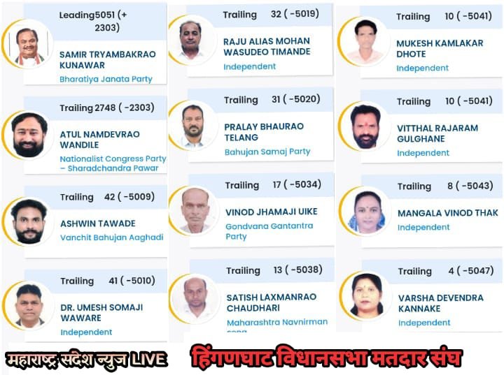 महाराष्ट्र संदेश न्युज ! ऑनलाईन हिंगणघाट:- विधानसभा मतदार संघात आज सकाळ पासून मतदान मोजणी ला सुरुवात झाली आहे. पहिल्या फेरीत भारतीय जनता पक्षाचे विद्यमान आमदार समिर कुणावर यांना 5051 मते मिळाली असून दुसऱ्या क्रमांकावर राष्ट्रवादी काँग्रेस श.प पक्षाचे उमेदवार अतुल वांदीले यांना 2748 मते मिळाली आहे. ते 2303 मताने पिछाडीवर आहे.