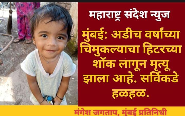 मुंबईतील नालासोपारा पूर्वेकडील आचोळे डोंगरी येथील एकता वाल्मिकी वेल्फेअर सोसायटी चाळीत राहणाऱ्या अंश कागडा या अडीच वर्षांच्या चिमुकल्याला हिटरचा करंट लागला त्यात अंशचा दुर्दैवी मृत्यू झाला. याप्रकरणी आचोळे पोलीस ठाण्यात अकस्मात मृत्यूची नोंद केली आहे.