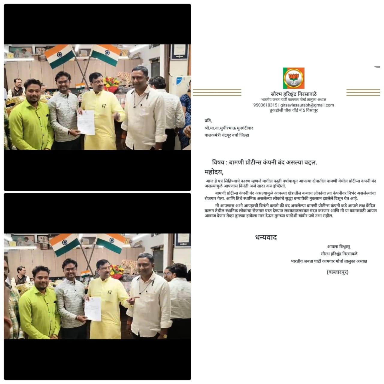 बंद बामणी  प्रोटीन्स कंपनी चालू करने हेतु, पूर्व मंत्री, विधायक श्री सुधीर भाऊ मुनगंटीवार जी को,भाजपा कामगार मोर्चा बल्लारपुर तालुका अध्यक्ष सौरभ गिरसावळे  के नेतृत्व में निवेदन दिया गया.