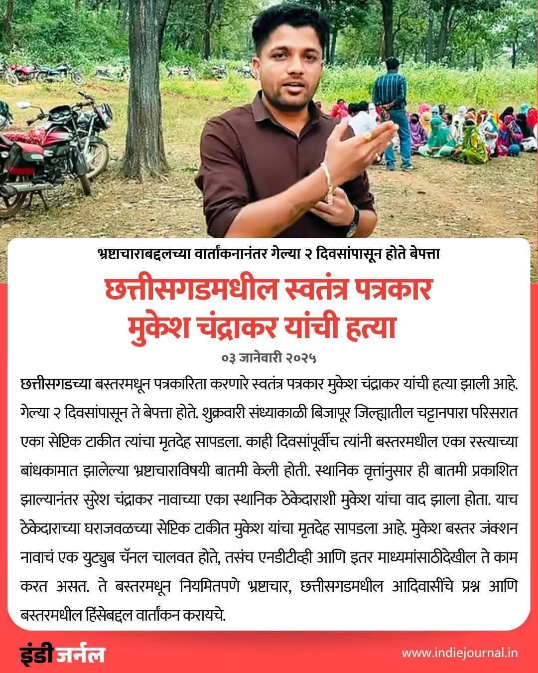 छत्तीसगड मधील N D T V चे पत्रकार मुकेश चंद्रकार यांची निर्घृण हत्या प्रकारणात गडचिरोली जिल्यातील पत्रकार उपस्थित राहण्याचे आवाहन.