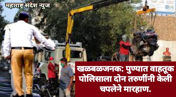 महाराष्ट्र संदेश न्युज ! ऑनलाईन पुणे:- येथून एक खळबळजनक घटना समोर आली आह. येथे मंगळवारी सकाळी 11.00 वाजताच्या सुमारास ‘नो पार्किंग’ मध्ये लावलेल्या गाड्यांवर कारवाई करण्यासाठी गेलेल्या वाहतूक पोलिसांना अटकाव करीत त्यांना दोन तरुणींनी चपलेने मारहाण केल्याची घटना हडपसरमध्ये घडली आहे. याप्रकरणी हडपसर पोलीस स्टेशन मध्ये गुन्हा दाखल करण्यात आला आहे. बालिका सूर्यवंशी आणि संगीत लांडगे अशी गुन्हा दाखल झालेल्या तरुणींची नावे आहेत. याप्रकरणी पोलीस हवालदार आजिनाथ आघाव यांनी फिर्याद दिली आहे.