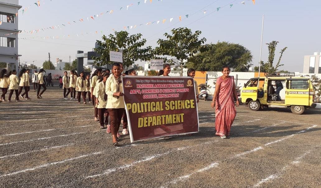 महाराष्ट्र संदेश न्युज ! ऑनलाईन हिंगणघाट:- मातोश्री आशाताई कुणावर कला वाणिज्य व विज्ञान महिला महाविद्यालय येथील राज्यशास्त्र विभागातर्फे जागतिक मतदान दिन साजरा करण्यात आला. या निमित्त रैली चे आयोजन करण्यात आले. या कार्यक्रमाला डॉ. उमेश तुळसकर प्राचार्य मातोश्री महिला महाविद्यालय हिंगणघाट, प्रा.अभय दांडेकर तसेच मातोश्री आशाताई कुणावार महिला महाविद्यालयाच्या उपप्राचार्या डॉ. सपना जयस्वाल व राज्यशास्त्र विभागाच्या प्रमुख प्रा. प्रतिभा दुबे, कला विभाग प्रमुख प्रा.भाग्यश्री साबळे, प्रा.नवले, प्रा.इंगळे, प्रा.घाटे यांची उपस्थिती होती. डॉ. सपना जैसवाल मैडम यानी मतदानाचे महत्व विषयी विद्यार्थ्यांना मार्गदर्शन केले.