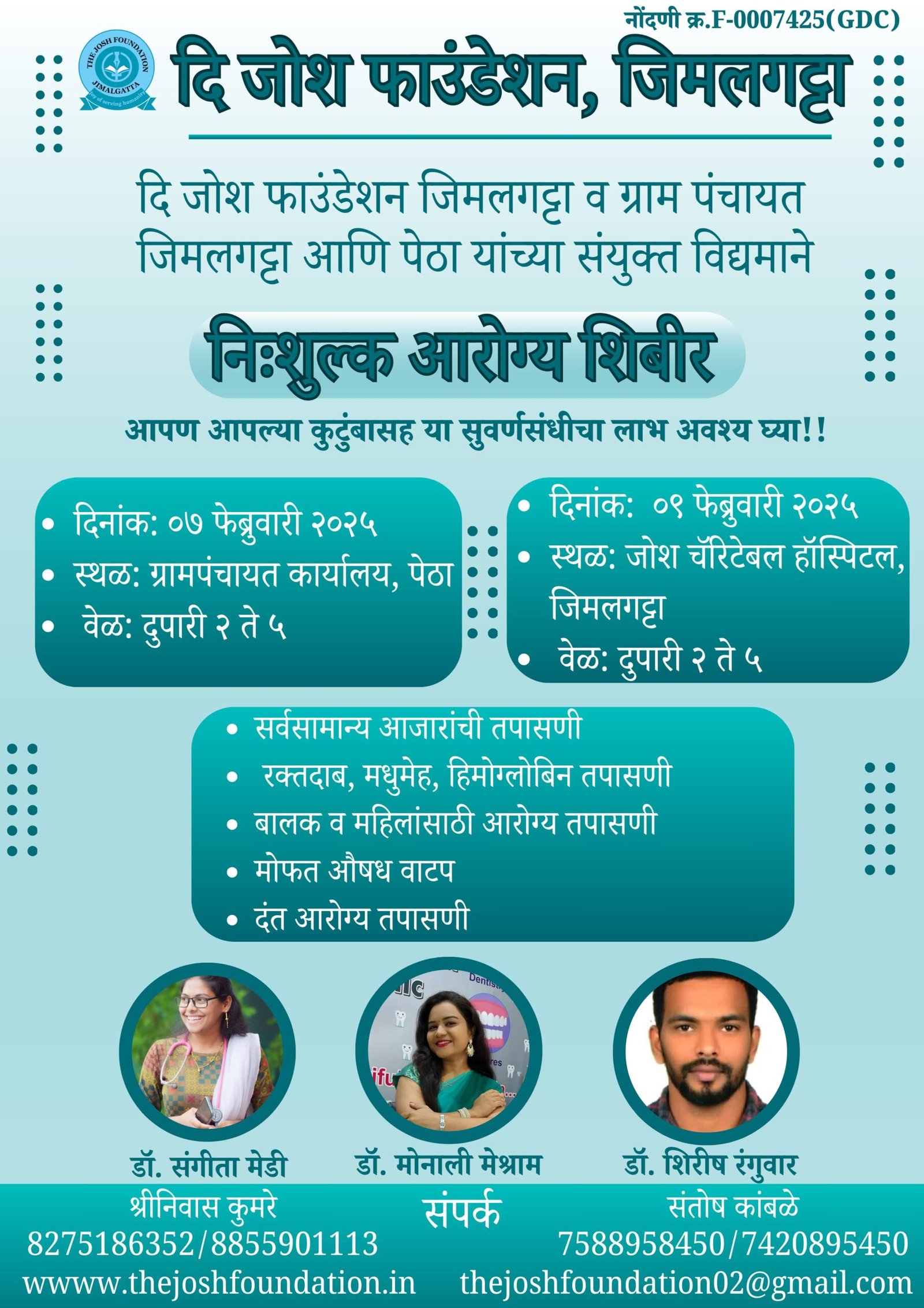 *दि जोश फाउंडेशन, जिमलगट्टा आणि ग्रामपंचायत जिमलगट्टा व पेठा* यांच्या संयुक्त विद्यमाने *निःशुल्क आरोग्य शिबिराचे* आयोजन करण्यात आले आहे. या शिबिरात तज्ञ डॉक्टरांकडून मोफत तपासणी व औषधोपचार उपलब्ध असतील.