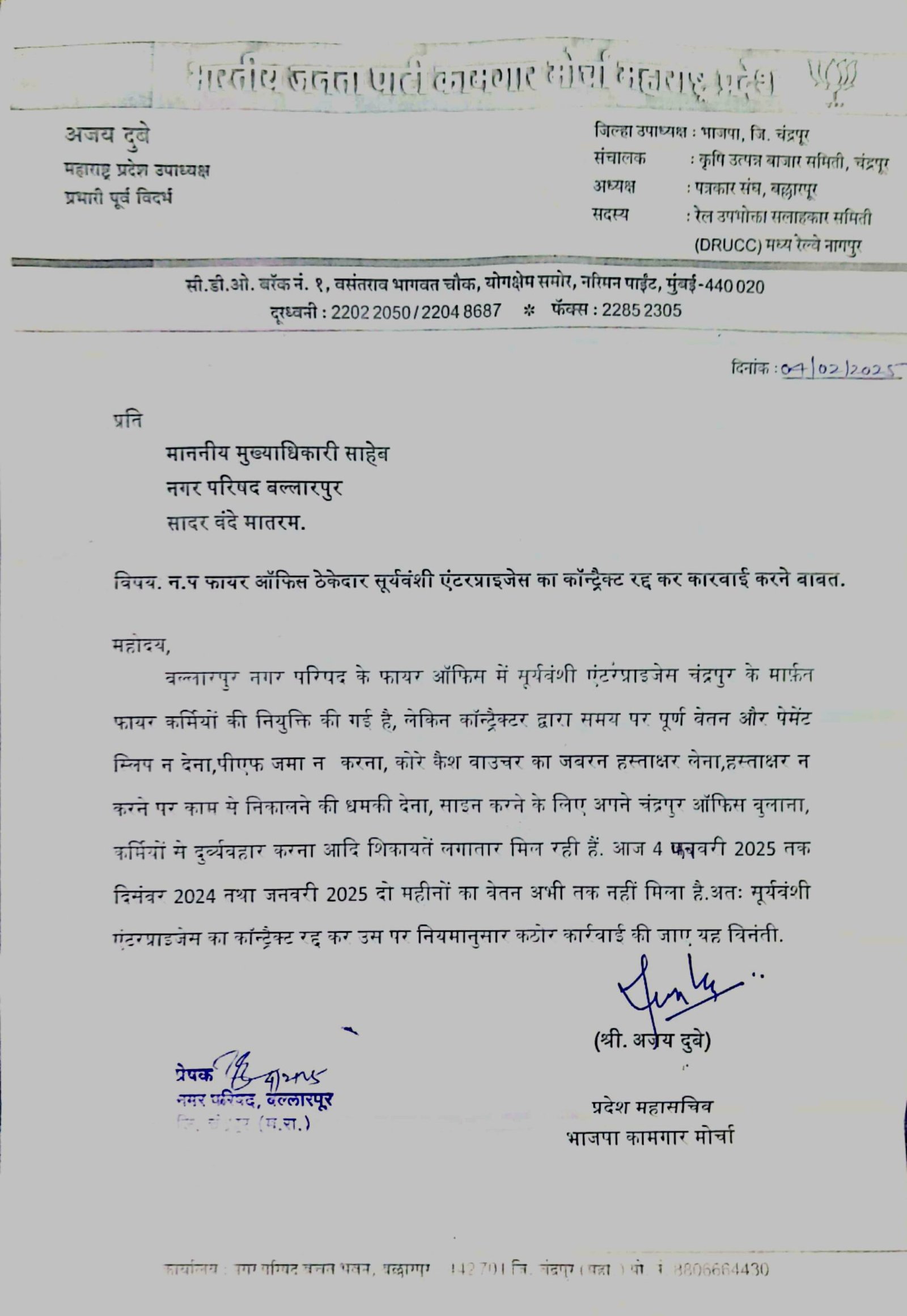 सूर्यवंशी एंटरप्रायझेस चंद्रपूर मार्फत बल्लारपूर नगर परिषदेच्या अग्निशमन कार्यालयात नगर परिषद मार्फ़त कंत्राटी अग्निशमन कर्मचाऱ्यांची नियुक्ती करण्यात आली आहे, परंतु कंत्राटदार पूर्ण पगार आणि पेमेंट स्लिप वेळेवर देत नाही, पीएफ जमा करत नाही, रिकाम्या कॅश व्हाउचरवर जबरदस्तीने सह्या घेत आहे आणि करारावर स्वाक्षरी न केल्या वर. कामातून कमी करण्याचे धमकी देणे, आपले चंद्रपूर कार्यालयात स्वाक्षरीसाठी बोलावणे, कामगारांशी गैरवर्तन करणे इत्यादी तक्रारी सातत्याने येत आहेत. आज ४ फेब्रुवारी २०२५ पर्यंत डिसेंबर २०२४ आणि जानेवारी २०२५ या दोन महिन्यांचा पगार अद्याप मिळालेला नाही. त्यामुळे सूर्यवंशी एंटरप्रायजेस च्या करार नामा रद्द करुन कठोर कार्रवाई करण्याची मागणि भाजप कामगार आघाडीचे राज्य सरचिटणीस अजय दुबे यांनी आमदार श्री सुधीरभाऊ मुनगंटीवार आणि मुख्याधिकारी विशाल वाघ यांना दिलेल्या निवेदनात केली आहे