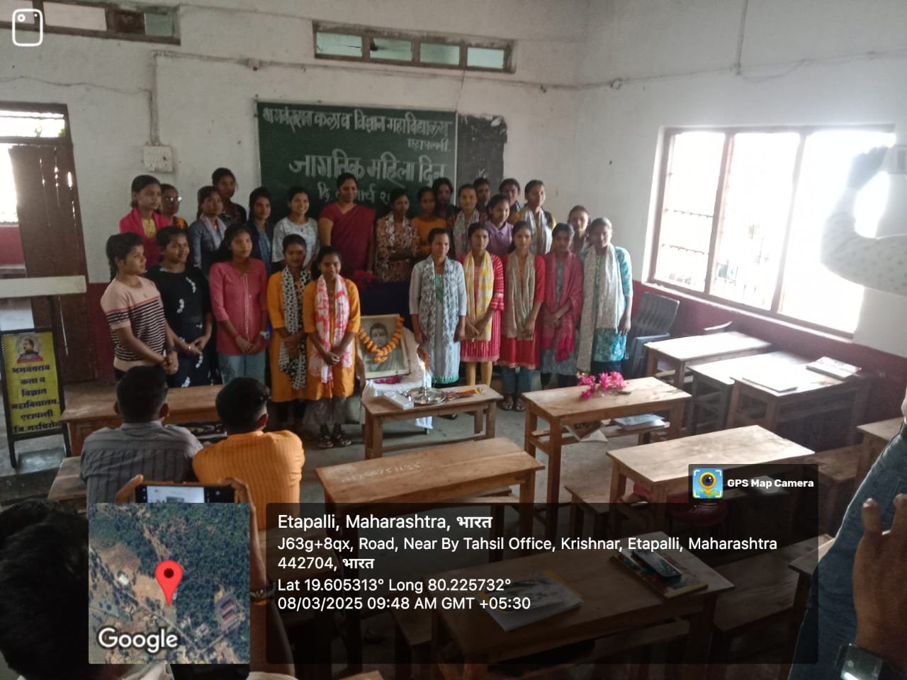 *_एटापल्ली:-_* गोंडवाना विद्यापीठ गडचिरोली संलग्नित भगवंतराव कला व विज्ञान महाविद्यालय एटापल्ली जि. गडचिरोली येथे सांस्कृतिक विभाग व राष्ट्रीय सेवा योजना विभागामार्फत जागतिक महिला दिन साजरा करण्यात आला.