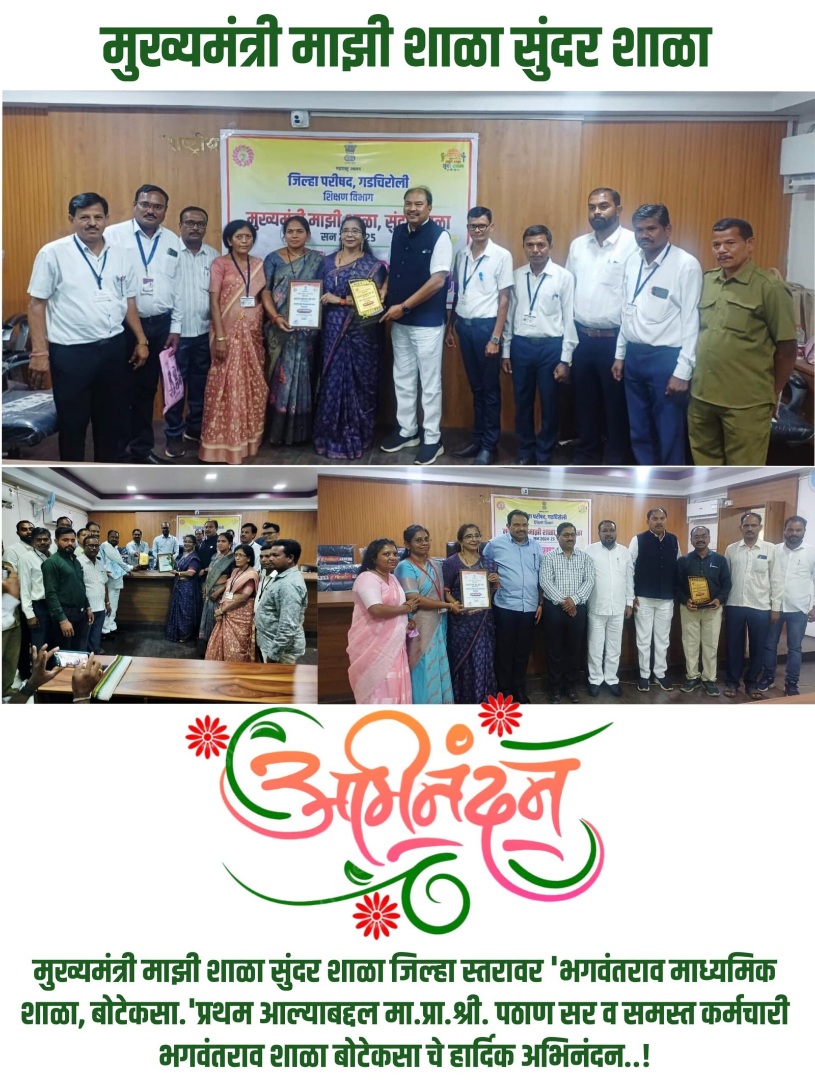 दिनांक 27/ 3/ 2025 रोजी जिल्हा परिषद गडचिरोली शिक्षण विभाग मुख्यमंत्री माझी शाळा सुंदर शाळा टप्पा 2 मध्ये सत्र 2024 -25 मध्ये गडचिरोली जिल्ह्यातून वनवैभव शिक्षण मंडळ अहेरी द्वारा संचालित भगवंतराव हायस्कूल बोटेकसा तालुका कोरची यांना प्रथम क्रमांक अकरा लाखाचे बक्षीस पटकाविल्याबद्दल जिल्हा परिषद गडचिरोली येथील मुख्य कार्यपालन अधिकारी माननीय श्री सुहास गाडे साहेब यांच्या हस्ते माननीय शमशेर खान पठाण मुख्याध्यापक यांना गौरविण्यात आले त्याप्रसंगी प्रमुख अतिथी म्हणून श्री माननीय वासुदेव भुसे साहेब शिक्षणाधिकारी माध्यमिक तसेच श्री पुनीत मातकर साहेब अधिव्याख्याता जिल्हा शिक्षण व प्रशिक्षण संस्था गडचिरोली तसेच उपमुख्य कार्यपालन अधिकारी माननीय भुयार साहेब प्रामुख्याने उपस्थित होते तसेच श्री बाबासाहेब पवार शिक्षणाधिकारी प्राथमिक व विवेक नाकाडे उपशिक्षणाधिकारी प्राथमिक यांच्या प्रमुख उपस्थितीत कार्यक्रम घेण्यात आले वरील सर्व कार्यक्रमात जिल्ह्यातून प्रथम द्वितीय तृतीय यांना सुद्धा गौरविण्यात आले याप्रसंगी प्रमुख पाहुण्यांचे मार्गदर्शन लाभले वरील कार्यक्रमाप्रसंगी उपस्थित वनवैभव शिक्षण मंडळ अहेरीचे उपाध्यक्ष माननीय श्री बबलू भैया हकीम यांचे सुद्धा मोलाचे मार्गदर्शन लाभले. या संपूर्ण कार्यक्रमात वनवैभव शिक्षण मंडळाचे पदाधिकारी सौ.लीना पठाण सदस्यां तसेच अब्दुल जहीर अब्दुल हकीम कोषाध्यक्ष हे सुद्धा उपस्थित होते. याप्रसंगी सर्व शिक्षक कर्मचारी व शिक्षकेतर कर्मचारी यांना सुद्धा शाल व श्रीफळ देऊन गौरविण्यात आले.