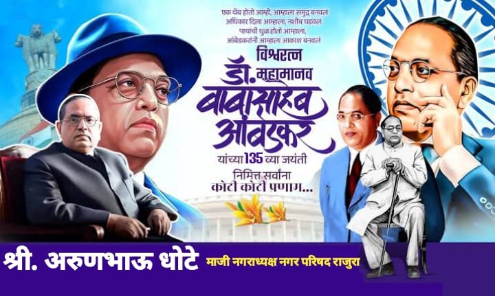 महाराष्ट्र संदेश न्यूज ! ऑनलाईन :- जागतिक दर्जाचे महान विचारवंत समाजसुधारक आणि भारतीय संविधानाचे शिल्पकार ज्यांनी दिन दलीत महिला सर्व समाजासाठी आयुष्यभर सामाजिक समानता, शिक्षण आणि मानवी हक्कांसाठी लढा दिला. अशा भारतरत्न डॉक्टर बाबासाहेब आंबेडकर यांना अभिवादन आणि सर्व नागरिकांना डॉक्टर बाबासाहेब आंबेडकर जयंतीनिमित्त खुप खुप शुभेच्छा. शुभेच्छुक अरुण भाऊ धोटे माजी नगराध्यक्ष नगर पालिका राजुरा.