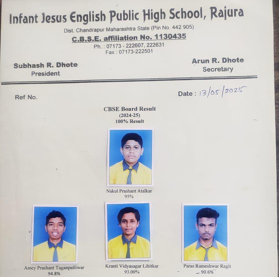 महाराष्ट्र संदेश न्युज ! ऑनलाईन राजुरा:- केंद्रीय माध्यमिक शिक्षण मंडळ (सीबीएसई) इयत्ता दहावी शालांत परीक्षेच्या आज जाहीर झालेल्या निकालात इन्फंट जिजस सोसायटी द्वारा संचालित इन्फंट जिजस इंग्लिश हायस्कूल राजुरा येथील विद्यार्थ्यांनी उत्कृष्ट कामगिरीच्या जोरावर १०० टक्के निकाल देण्याची आपली परंपरा कायम राखली आहे.