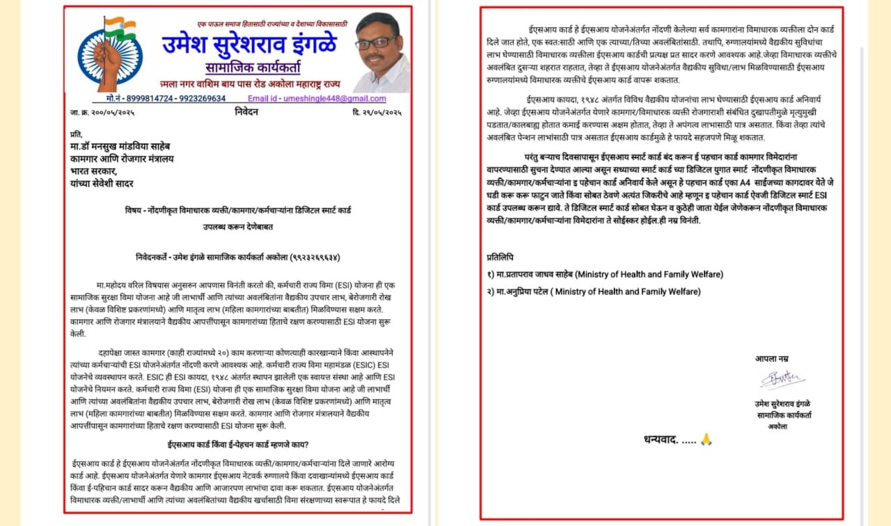 नोंदणीकृत विमाधारक व्यक्ती/कामगार/कर्मचाऱ्यांना डिजिटल स्मार्ट कार्ड उपलब्ध करून द्या; सामाजिक कार्यकर्ते उमेश इंगळे यांचे केन्द्रीय आरोग्य मंत्र्यांना पत्र
