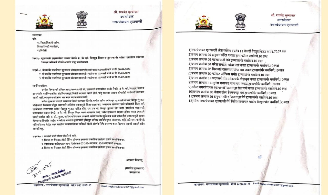 नगरसेवक राघवेंद्र सुल्वावार यांनी या संदर्भात थेट जिल्हाधिकाऱ्यांकडे धाव घेतली आहे. त्यांनी पत्रव्यवहार करत एटापल्ली शहरासाठी तातडीने स्वतंत्र 11 के.व्ही विद्युत फिडर आणि नवीन ट्रान्सफॉर्मर मंजूर करण्याची मागणी केली आहे.