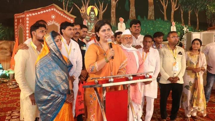 शिवमहापुराण कथेचे कथाव्यास पं. प्रदीप मिश्रा यांचे दर्शन घेऊन पंकजाताई मुंडे यांनी आरतीमध्ये सहभाग घेतला.या कार्यक्रमास हजारो भाविक उपस्थित होते.