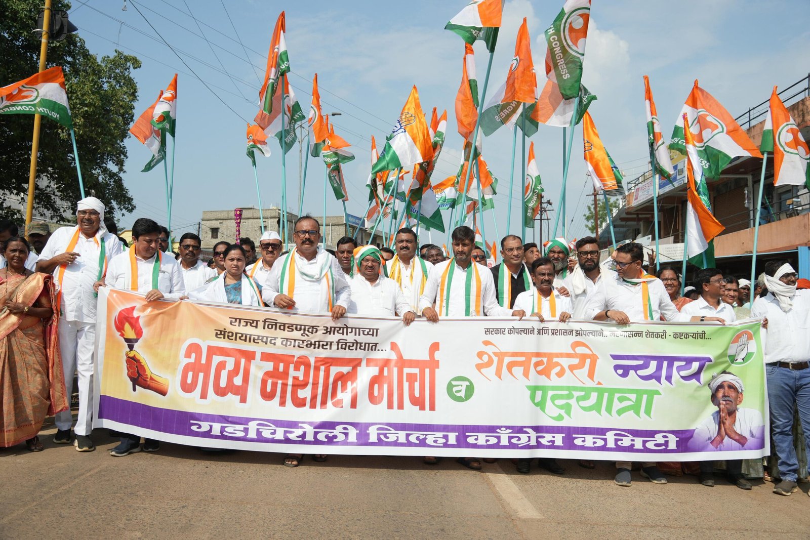 गडचिरोली :: गडचिरोली येथे काँग्रेस प्रदेशाध्यक्ष हर्षवर्धन सपकाळ यांच्या नेतृत्वात भव्य मशाल मोर्चा व शेतकरी न्याय पदयात्रा तथा शेतकरी मेळावा पार पडला, या माध्यमातून शेतकऱ्यांचे प्रश्न, त्यांचे हक्क आणि विविध समस्या केंद्रस्थानी ठेवून आवाज उठवण्यात आला.