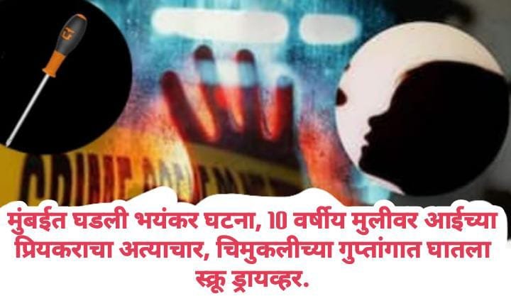 प्राप्त माहितीनुसार, मुंबई येथील जोगेश्वरी पूर्व भागात 10 वर्षीय अल्पवयीन मुलीवर तिच्याच आईच्या प्रियकराने अनेक वेळा अत्याचार केला आहे. घरात कुणीही नसताना आरोपी तिच्या घरी यायचा आणि या चिमुकल्या मुलीवर लैंगिक अत्याचार करायचा. चार ते पाच वेळा अत्याचार करून त्याने चिमुकलीच्या गुप्तांगात स्क्रू ड्रायव्हर घातलं.
