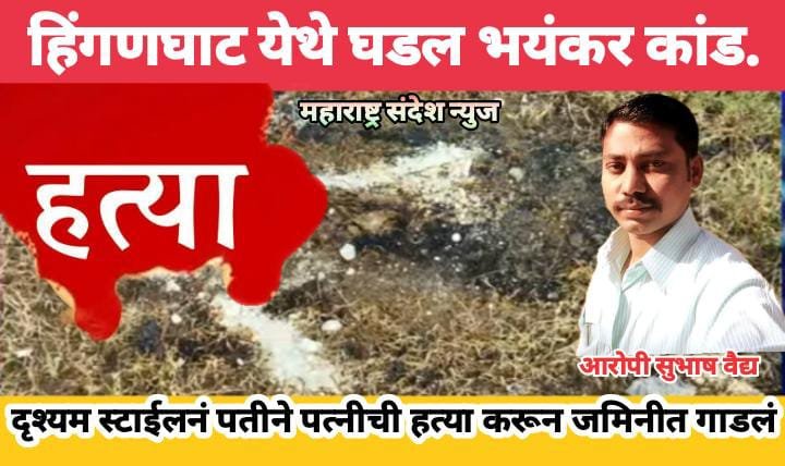 महाराष्ट्र संदेश न्युज ! ऑनलाईन हिंगणघाट:- येथून एक खळबळजनक घटना समोर आली आहे. येथे एका नराधम पतीने आपल्याच पत्नीची हत्या करून दृश्यम स्टाईलने मृतदेह घरातच पुरल्याची धक्कादायक माहिती समोर आली आहे. ही घटना आज 5 वाजताच्या सुमारास समोर आली आहे. ही घटना समोर येताच संपूर्ण हिंगणघाट शहरात खळबळ माजली आहे. सुभाष वैद्य राहणार ओंकार नगर येनोरा माता मंदिर परिसर असे आरोपी पतीचे नाव असून तो सध्या फरार आहे. पोलिस त्याचा शोध घेत आहे.