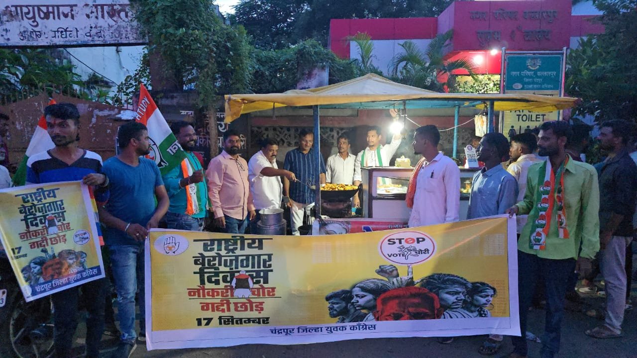 महाराष्ट्र संदेश न्युज ! ऑनलाईन चंद्रपूर:- पंतप्रधान नरेंद्र मोदी यांच्या वाढदिवसी “राष्ट्रीय बेरोजगार दिवस” म्हणून नोंद घेत चंद्रपूर जिल्हा ग्रामीण युवक काँग्रेसतर्फे बल्लारपूर येथे भजे तळा आंदोलन करण्यात आले. युवक काँग्रेसचे जिल्हाध्यक्ष शंतनू धोटे यांच्या नेतृत्वाखाली आयोजित या आंदोलनात बल्लारपूर विधानसभेतील युवक काँग्रेस पदाधिकारी, कार्यकर्ते आणि बेरोजगार युवक मोठ्या संख्येने सहभागी झाले. सुशिक्षित असूनही रोजगार न मिळाल्याने हताश झालेल्या युवकांनी शासनाविरोधात संतप्त घोषणाबाजी केली. “रोजगार द्या, अन्यथा गादी सोडा”, “बेरोजगारी हटवा – युवा वाचवा” अशा घोषणा देत बेरोजगारीच्या तीव्र समस्येकडे सरकारचे लक्ष वेधण्यात आले.