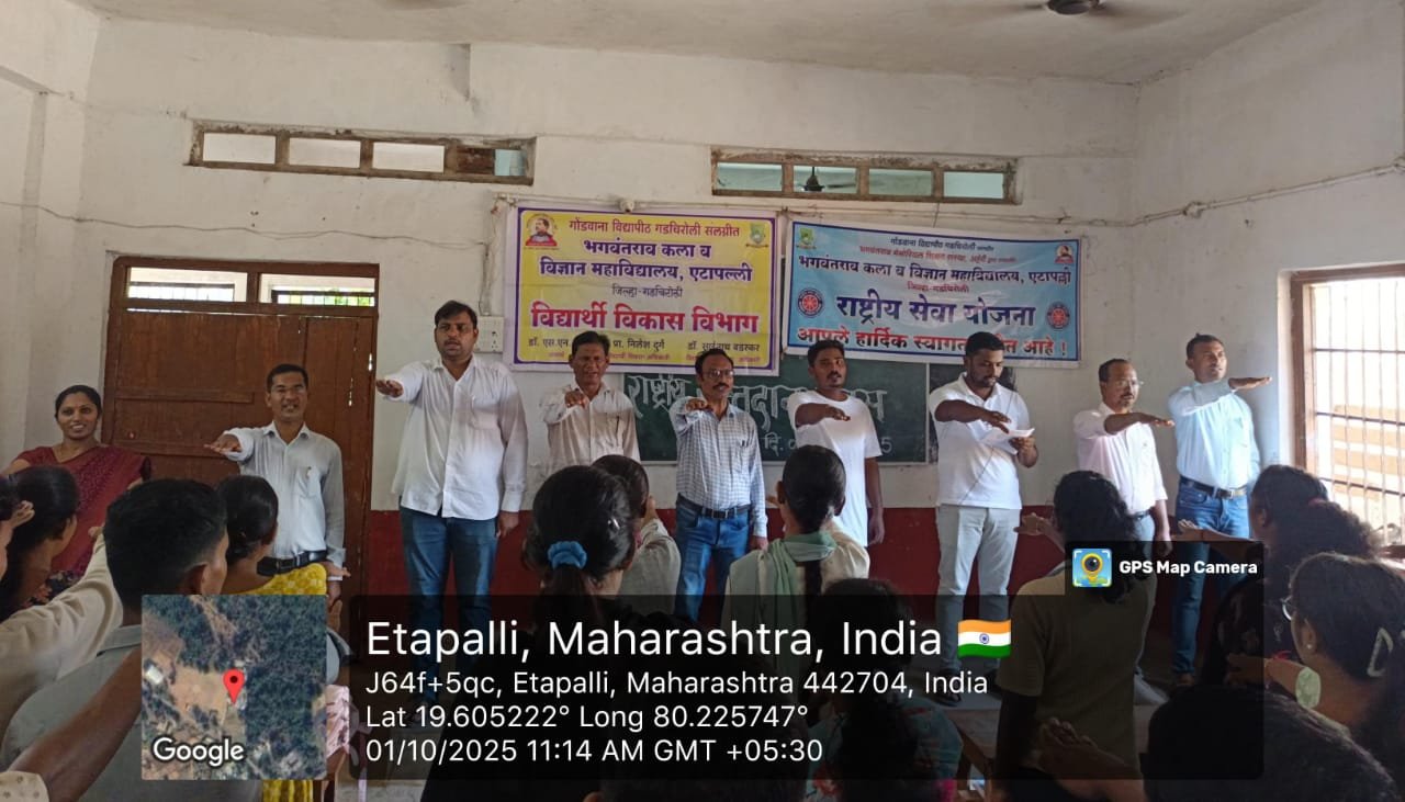 महाराष्ट्र संदेश न्युज ! ऑनलाईन एटापल्ली:– भगवंतराव कला व विज्ञान महाविद्यालय एटापल्ली, जिल्हा गडचिरोली येथे 1 ऑक्टोबर “राष्ट्रीय रक्तदान दिना”निमित्त पोलीस स्टेशन एटापल्ली आणि भगवंतराव महाविद्यालय एटापल्ली येथील राष्ट्रीय सेवा योजना आणि विद्यार्थी विकास विभाग यांच्या संयुक्त विद्यमाने राष्ट्रीय रक्तदान दिन साजरा करण्यात आला. यावेळी या कार्यक्रमात प्रमुख पाहुणे म्हणून डॉ.बि.डी. कोंगरे, डॉ.व्हि.ए. दरेकार, ज्ञानेश्वर कोल्हे (पोलीस उपनिरीक्षक, पोलीस स्टेशन, एटापल्ली), डॉ. निलेश दुर्गे (विद्यार्थी विकास अधिकारी), राघवेंद्र सुल्वावार (माजी बांधकाम सभापती, नगरपंचायत एटापल्ली) राहुल कुडमेथे (नगरसेवक, नगरपंचायत एटापल्ली), प्रा. भारत सोनकांबळे, डॉ. श्रुती गुब्बावार (रासेयो सहाय्यक कार्यक्रम अधिकारी), प्रा. चिन्ना पुंगाटी (रासेयो सहाय्यक कार्यक्रम अधिकारी), प्रा.राहुल ढबाले, प्रा. अतुल बारसागडे, प्रभाकर नाईक (पोलिस हवालदार) इत्यादी उपस्थित होते.