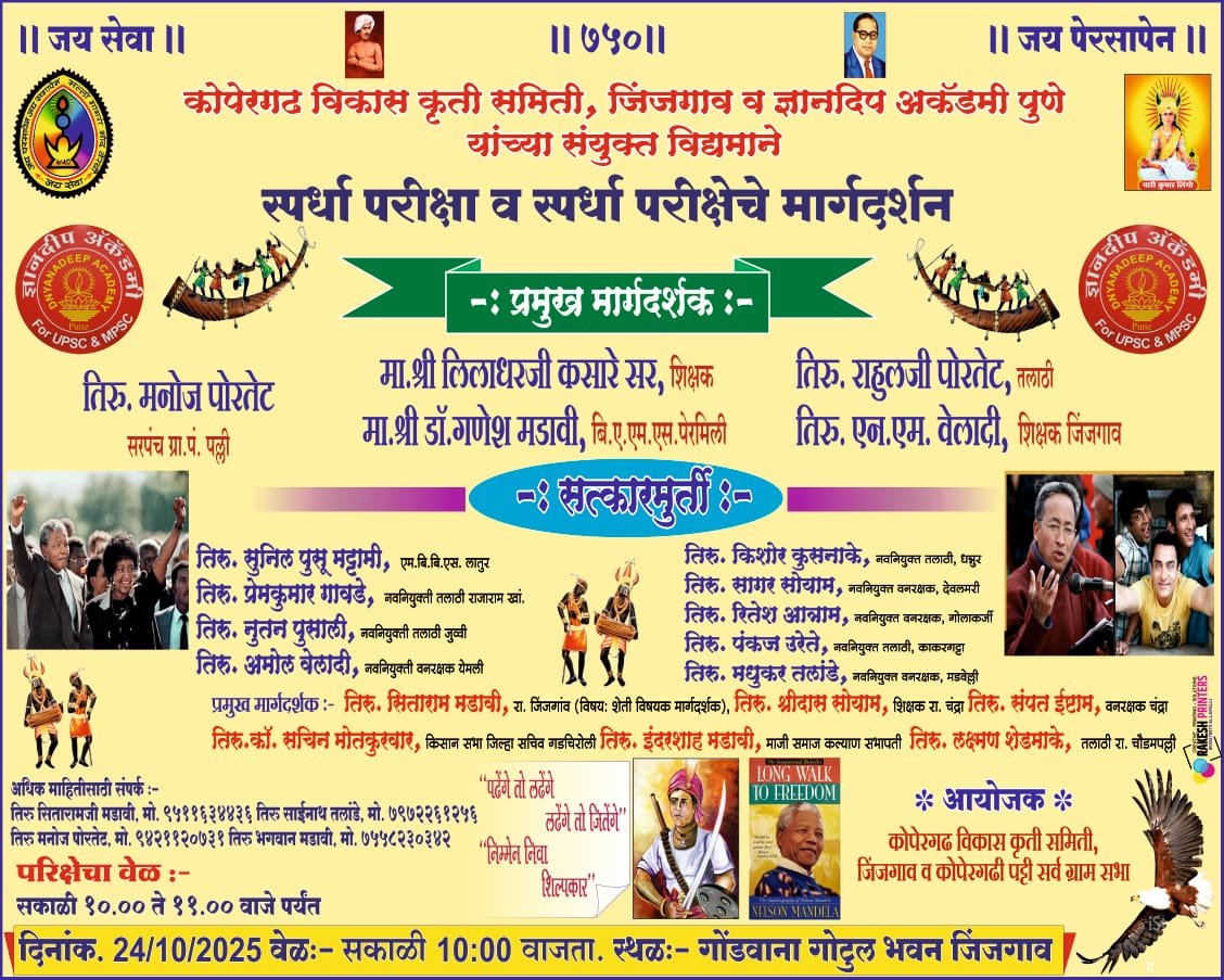 शुक्रवार दिनांक 24/10/2025 ला घेणात येणारा निश्चित वेळ काळ व नियोजन जिंजगाव समितीने अंतिम स्वरुप दिला असून, त्यात कुठलाही बदल करण्यात येणार नाही,याची परीक्षार्थनी नोंद घ्यावी, जिंजगाव येतील परीक्षेत बसणारे विद्यार्थी परीक्षाचे अटी सर्ती नियम तंतोतंत पाडावे जेने करुन आपण आपल्या भविष्यात होणारे MPSC,UPSC,सरळ सेवा परीक्षेत सवय लागाव,त्यात आपला मुले टिकावा, त्या परीक्षाचे अटी सर्ती पालण करुन आपले गोरगरीब मुले, मुली पुढे जावे,हेच उदेश डोळ्यापुढे ठेवून ही परीक्षा घेण्याचे एकमेव उद्देश आहे,तरी या परीक्षाचे फायदा घेण्यासाठी जास्तीत जास्त विध्यार्थ्यांनी भाग घ्यावी, असे जिंजगाव समितीचे सर्वपदाधिकाऱ्यांनी आग्रहाची विनंती करीत आहे,