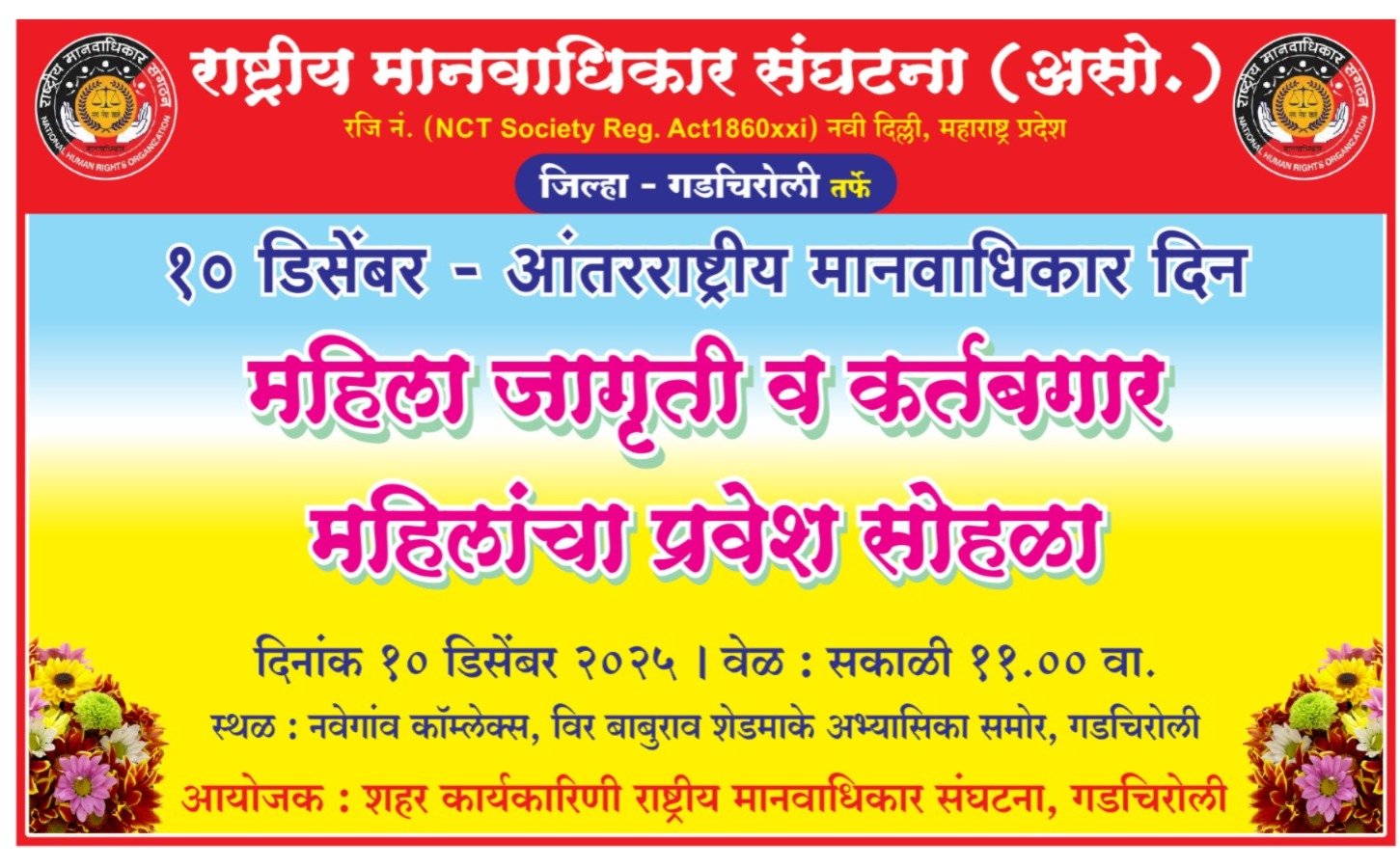 गडचिरोली येथे उद्या दिनांक 10 डिसेंबर 2025 बुधवार ला राष्ट्रीय मानवाधिकार संघटना जिल्हा गडचिरोलीच्या वतीने उद्या 10 डिसेंबर रोज बुधवारी आंतरराष्ट्रीय मानवाधिकार दिन निमित्ताने महिला जागृती व कर्तबगार महिलांचा भव्य प्रवेश सोहळा आयोजित करण्यात आला आहे या कार्यक्रमाचे अध्यक्ष –