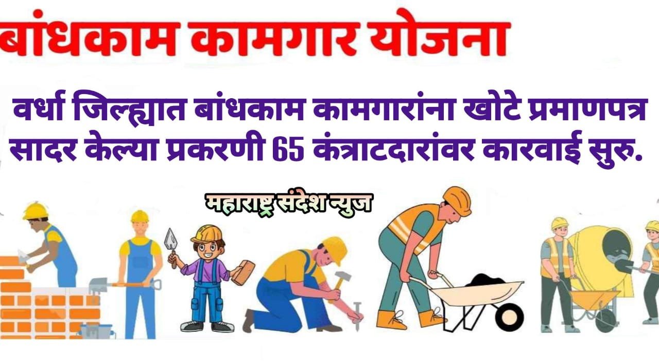महाराष्ट्र संदेश न्युज ! ऑनलाईन वर्धा:- बांधकाम कामगारांना 65 ठेकेदार व कंत्राटदारांनी 90 दिवसांचे बोगस खोटे प्रमाणपत्र सादर केल्या प्रकरणी सरकारी कामगार अधिकारी कार्यालया तर्फे नोटीस बजावून त्यांच्या विरुध्द धडक कार्यवाही सुरु केली आहे. त्यातील काही कंत्राटदारांनी आमच्या सही व शिक्क्याचा गैरवापर केला असल्याचे सरकारी कामगार अधिकारी कार्यालयास लेखी निवेदन दिले असल्यामुळे कार्यालयाच्या वतीने कंत्राटरांचे 90 दिवसाचे प्रमाणपत्र रद्द करण्यात आले आहे. उर्वरीत काही ठेकेदारांवरी कार्यवाही करण्यात येत आहे. यासाठी जिल्ह्यातील दलाल, एजंन्ट, कंत्राटदार व काही संघटना यांचे धाबे दणाणले आहे.
