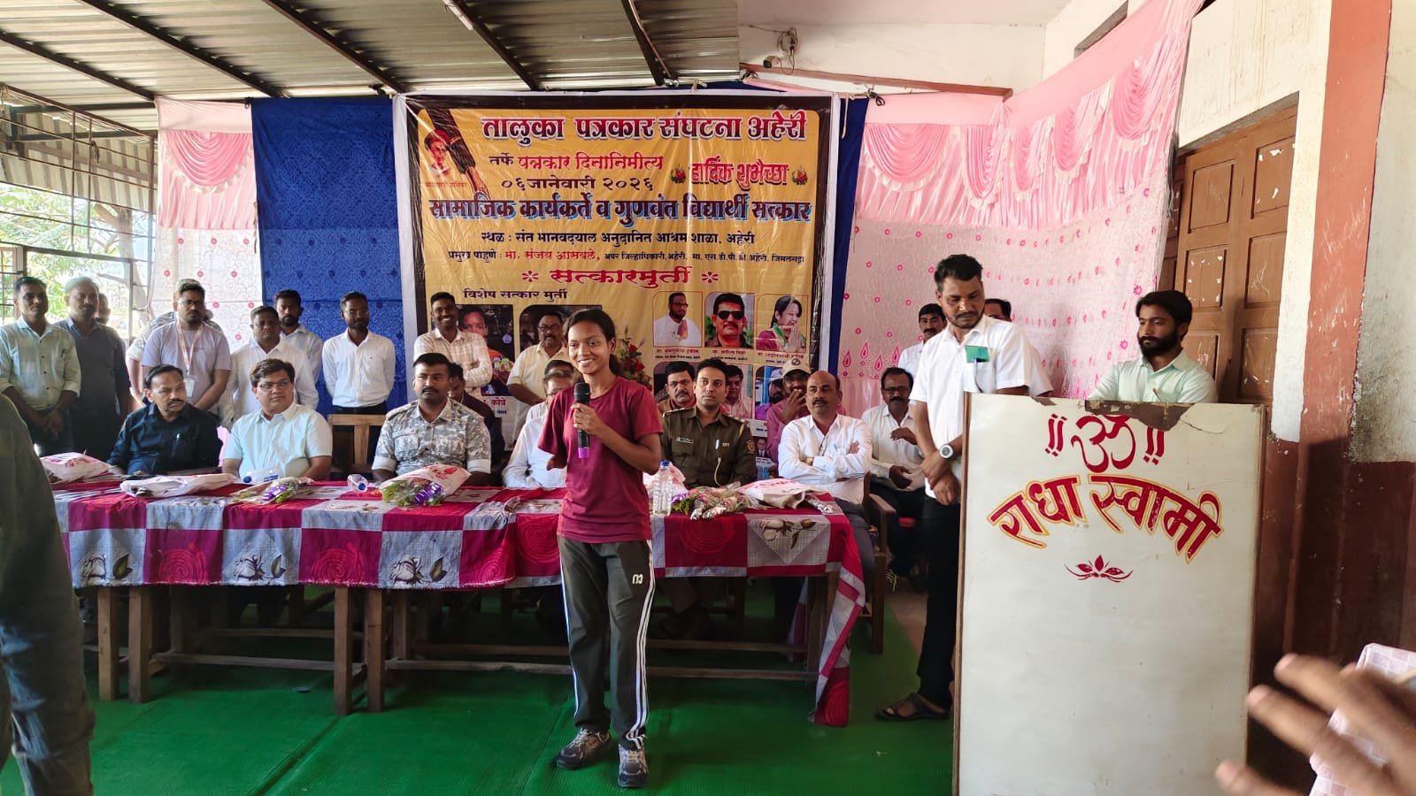 स्थानिक संत मानवदयाल अनुदानित आश्रम शाळेत आयोजित केलेल्या कार्यक्रमाचे सत्कारमूर्ती म्हणून दुबई येथे तिरंदाजी स्पर्धेत प्यारा गेम्स मध्ये सुवर्णपदक पटकाविणारी श्वेता भास्कर कोवे, बबलू भैया हकीम, आशिषभाऊ पिपरे, शाहीन भाभी हकीम, डॉ.किरण वानखेडे, वनपरिक्षेत्राधिकारी गौरव गणवीर व जावेद अली, युवा ग्रामीण पत्रकार संघटनेचे जिल्हा अध्यक्ष मधुकर गोंगले यांचा समावेश होता.