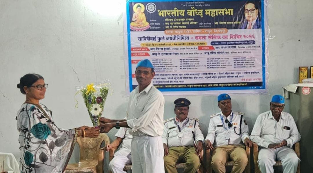महाराष्ट्र संदेश न्युज ! ऑनलाईन राजुरा:- भारतीय बौद्ध महासभा, तालुका राजुरा, शहर, ग्राम शाखा यांच्या मार्फत राजुरा येथील सम्यक बुध्द विहार सोमनाथपूर वॉर्ड राजुरा येथे दिनांक 04 जानेवारी रोज रविवारला समता सैनिक दलचे प्रशिक्षण शिबिर घेण्यात आले. समता सैनिक दलचे ध्वजचे ध्वजारोहण किशोर तेलतुंबडे जिल्हा अध्यक्ष यांच्या हस्ते उद्घाटन करून परिचय दिला समता सैनिक दलाच्या मेजर व बौध्द उपसाक व उपासिकानी ध्वजाला जय भीम म्हणून मानवंदना देण्यात आली.