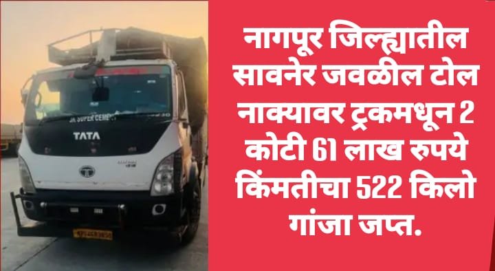 महाराष्ट्र संदेश न्युज ! ऑनलाईन नागपूर:- रविवारी पहाटेच्या सुमारास नागपूर जिल्ह्यातील सावनेर जवळ असलेल्या भागीमहारी टोल नाक्यावर डीआरआयने एका ट्रकमधून 522 किलो गांजा जप्त केल्याने एकच खळबळ उडाली आहे. हा गांजा ओडिशा राज्यातून मध्यप्रदेशच्या दिशेने कुलर, पंखे, ब्लँकेट, जॅकेट भरलेल्या ट्रकमधून जात होता. या गांजाची बाजार भावानुसार किंमत 2 कोटी 61 लाख रुपये असल्याचे सांगण्यात आले.