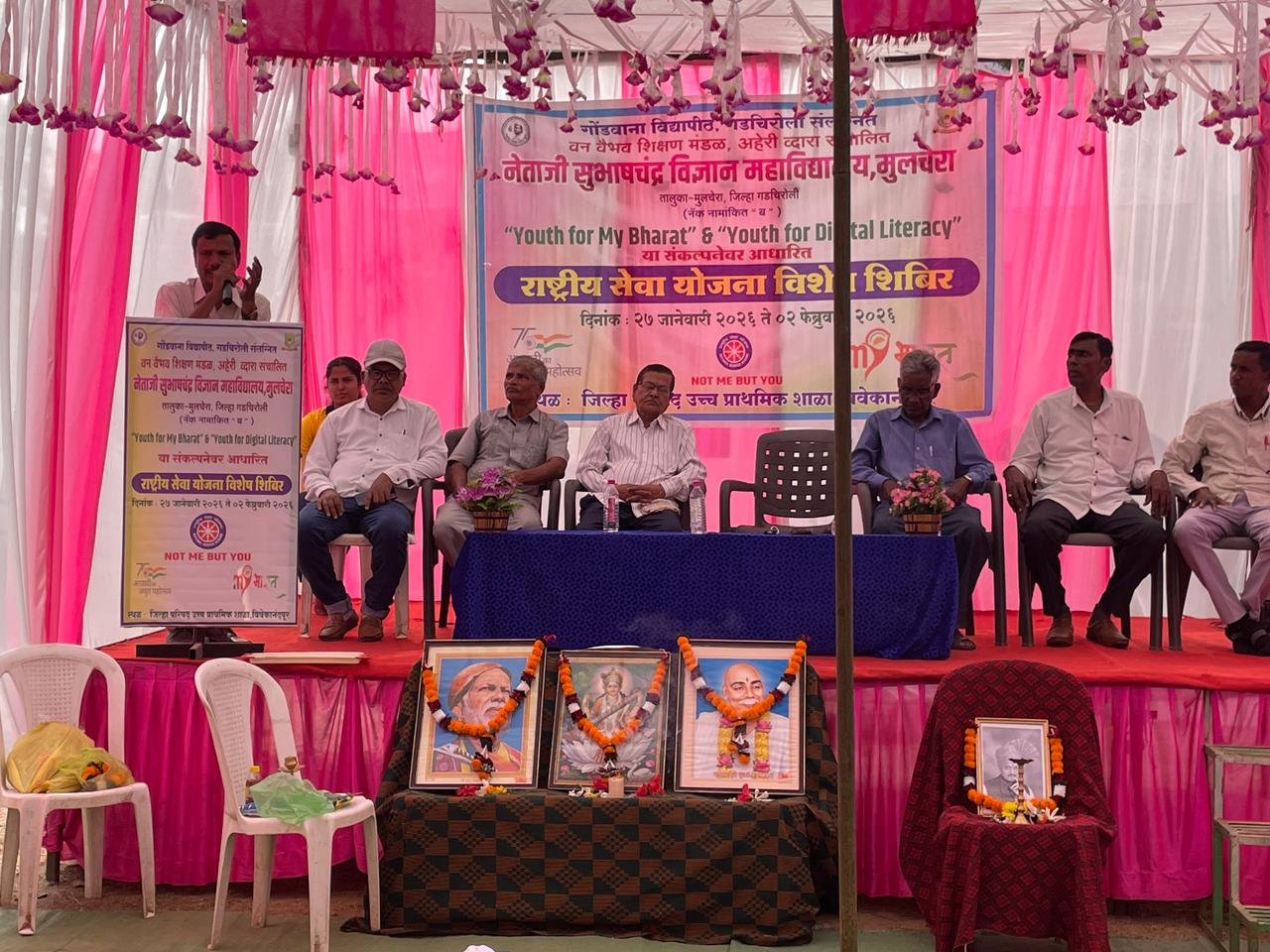 वन वैभव शिक्षण मंडळ अहेरी द्वारा संचालित नेताजी सुभाषचंद्र विज्ञान महाविद्यालय, मुलचेरा येथील राष्ट्रीय सेवा योजना (रा.से.यो.) विभागामार्फत आयोजित विशेष श्रमसंस्कार शिबिराचे उद्घाटन दिनांक २८ जानेवारी २०२६ रोजी जिल्हा परिषद प्राथमिक शाळा, विवेकानंदपूर (गणेशनगर) येथे उत्साहात पार पडले. हे शिबिर “Youth for My Bharat” आणि “Youth for Digital Literacy” या संकल्पनेवर आधारित असून दिनांक २७ जानेवारी ते २ फेब्रुवारी २०२६ या कालावधीत आयोजित करण्यात आले आहे.