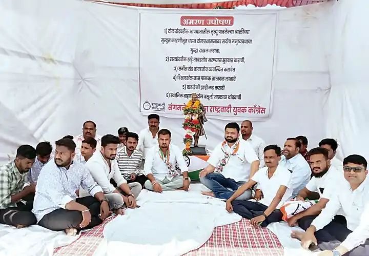 संगमनेर:- पुणे- नाशिक राष्ट्रीय महामार्गावर पडलेले खड्डे बुजवून या महामार्गासह सर्विस रस्त्यांची दुरुस्ती तत्काळ सुरू करावी, या मागणीसाठी हिवरगाव पावसा टोल प्लाझा कंपनीसमोर संगमनेर शहर व तालुका युवक राष्ट्रवादी काँग्रेसच्या वतीने टोल कंपनीविरोधात घोषणाबाजी करीत आमरण उपोषण सुरू केले गेले आहे.