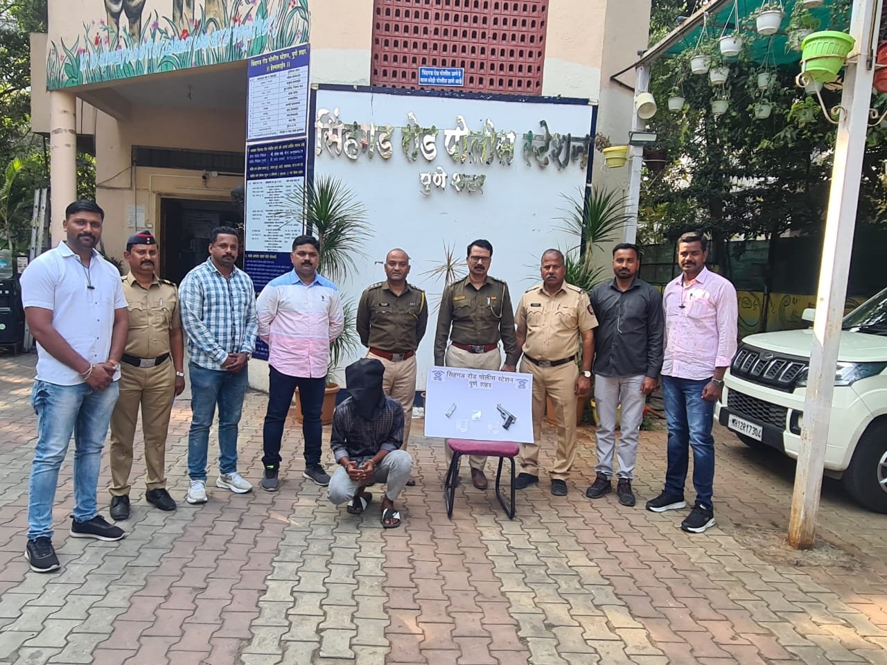 पुणे : सदर बाबत अधिक माहिती अशी की, सिंहगड रोड पोलीस स्टेशन हादीत रेकॉर्डवरील आरोपी तसेच संशयीत इसम व गुन्हयाना आळा घालण्यासाठी मा. वरिष्ठ पोलीस निरीक्षक सिहगडरोड पो स्टे पुणे व मा.पोलीस निरीक्षक (गुन्हे), सिंहगडरोड पोलीस स्टेशन पुणे शहर याचे आदेशाने गुन्हेप्रतिबंधात्मक पेट्रोलिंग करत असताना पोलीस अमालदार आबा उत्तेकर, राहुल ओलेकर य शिवाजी क्षीरसागर यांना त्याचे बातमीदारामार्फत बातमी मिळाली की दळवीवाडी फाटा प्रथमेश हॉटेल जवळ एक इसम संशयीत रित्या हालचाली करीत बांबलेला आहे त्याने अंगात निळसर रंगाधा त्यावर काळे रंगाचे चौकटी डिझाईन असलेला शर्ट व निळसर रंगाची जिन्स पेन्ट घातलेली आहे. अशी खात्रीशीर बातमी मिळाल्याने सदरची बातमी सपोनि सचिन निकम यांना कळविली असता त्यांनी ती वरिष्ठांना कळवून वरिष्ठांनी योग्यती कारवाई करण्याचे आदेशित केल्याने सदर बातमीच्या ठिकाणी जावुन मिळालेल्या बातमीप्रमाणे खात्री करता बातमीतील वरील वर्णनाचा इसम सदर ठिकाणी उभा असल्याचे दिसले त्याची व आमची नजरा नजर होताच तो इसम त्या ठिकाणावरुन नजर चुकवून पळुन जाण्याचा प्रयत्न करीत असतानाच त्यास स्टाफचे मदतीने त्याचा पाठलाग करुन काही अंतरावर त्याला शिताफीने पकडुन त्यास त्याचे नाव व पत्ता विचारले असता त्याने त्याचे नाव सागर जानु देबे वय २३ वर्षे रा.मु पो दिये वस्ती. सरकारी शाळेजवळ ता. वेल्हे जि.पुणे असे सांगितले असता त्याची पंचासमक्ष अंगझडती घेता त्याचेकडे एक पिस्टल ५०,०००/- रुपये किंमतीचे ५००/-रुपये किंमतीचे एक जिवंत काडतुसे असा एकूण ५०.५००/- रुपये किंमतीचा मुद्देमाल जप्त करण्यात आला असून त्याचे विरुद्ध सिंहगडरोड पोलीस स्टेशन येथे गुन्हा दाखल करण्यात आला असुन पुढील तपास पोलीस उप निरीक्षक गणेश मोकाशी हे करीत आहेत.