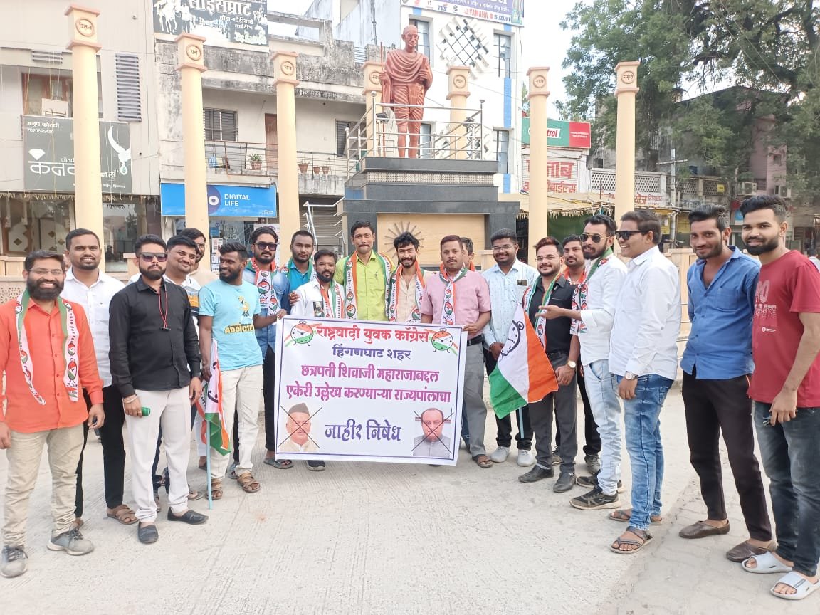 राज्यपाल भगतसिंग कोषारी व भाजपा खासदार शुधांशु त्रिवेदी यांनी छत्रपती शिवाजी महाराज यांच्या विषयी अपशब्द बोलल्याबाबद राज्यातील जनता सर्विकडे रोष व्यक्त करतआहे राज्यपालांनी पदाचा राजीनामा द्यावा व तसेच खासदार त्रिवेदी यांची पक्षातून हकालपट्टी करून त्यांच्यावर कडक कार्यवाही करावी असे व्यक्तव राज्यातील जनतेकडून होत आहे. छत्रपती शिवाजी महाराज यांच्याबद्दल अपशब्द राष्ट्रवादी युवक काँग्रेस कदापी सहन करणार नाही. करीता कारंजा चौक हिंगणघाट येथे राष्ट्रवादी युवक काँग्रेस तर्फे घोषणा देत त्यांचा निषेध करण्यात आला..