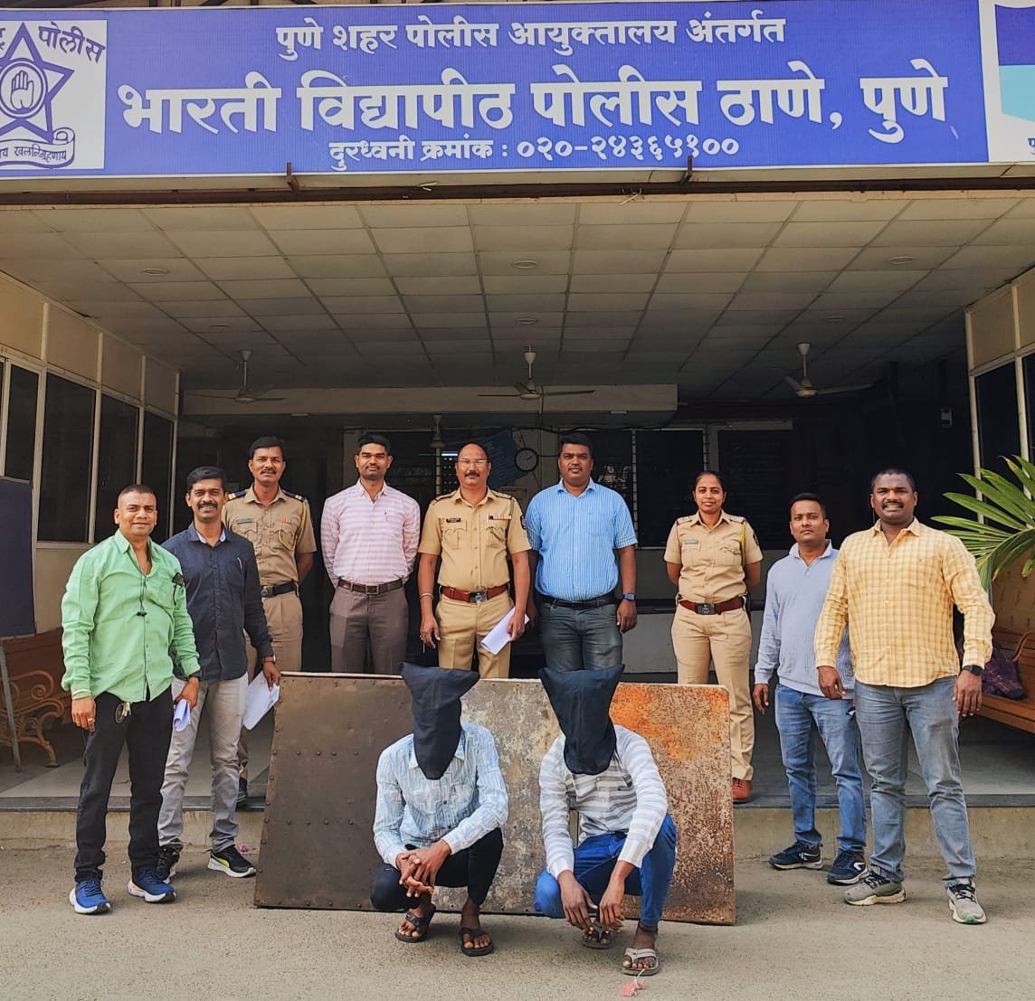 त्यानुसार तपास पथकाचे अधिकारी व पोलीस अंमलदार हे भारती विद्यापीठ पोलीस स्टेशन गुन्हा रजि नंबर ८५४/२०२२ मादंवि कलम ३७९ या गुन्हयातील अज्ञात आरोपीतांचा शोध घेण्यासाठी घटनास्थळावरील सी.सी.टी.वी कॅमेरे व तांत्रिक विश्लेषण करीत असताना पोलीस अंमलदार मितेश चोरमोले अभिनय चौधरी, आशिप गायकवाड यांना सदरचा गुन्हा भारती विद्यापीठ पोलीस स्टेशनचे रेकॉर्डवरील विधीसंगीत बालकाने त्याचे साथीदारांचे मदतीने केला असल्याची माहीती मिळाली. त्यांनी सदर विधीसंघर्षीत बालकास साव्यात घेवुन त्याचेकडे तपास करता त्याने त्याचे साथीदार दत्ता धनाजी पाटोळे २. साहील दत्ता डावरे व आणखीन दोन विधीसंघर्षीत बालका असे रायांनी मिळुन दिनांक २०/१२/२०२२ रोजी पहाटे ०३.०० वा चे सुमारास जांभुळवाडी रोड, लिपाणे वस्ती, ब्ली कोस्ट बिल्डींगचे पाठीमागील मोकळ्या जागेमधुन बिल्डींगचे कामकाजाच्या प्लेटा चोरी केल्या असल्याची कबुली दिल्याने आरोपी १. दत्ता धनाजी पाटोळे वय २० वर्षे, रा. तळजाई वसाहत, गल्ली नंवर ४४ पदमावती, पुणे २. साहील ‘दत्ता ढावरे, वय १९ वर्षे, रा. तळजाई वसाहत म्हसोबा मंदीरजवळ, पदमावती, पुणे यांना गुन्हयामध्ये अटक करून त्यांचेकडुन गुन्हयातील चोरी केलेल्या १,१०,०००/- रुपये (सध्याच्या बाजारभावानुसार ) किंमतीच्या एकुण १५० लोखंडी प्लेटा जप्त करण्यात आल्या आहेत.